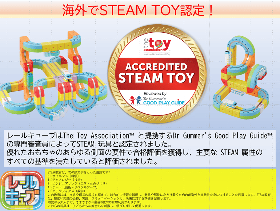 レールキューブはThe Toy Association™ と提携するDr Gummer's Good Play Guide™ の専⾨審査員によってSTEAM 玩具と認定されました。